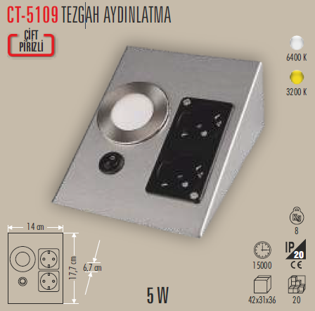 Cata 5W Çift Prizli Tezgah Aydınlatma 3200K Gün Işığı CT-5109